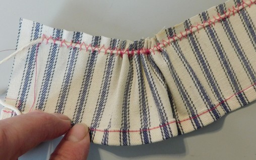 Pull threads gently to slightly gather the easing piece so it matches the 5″ attachment line.