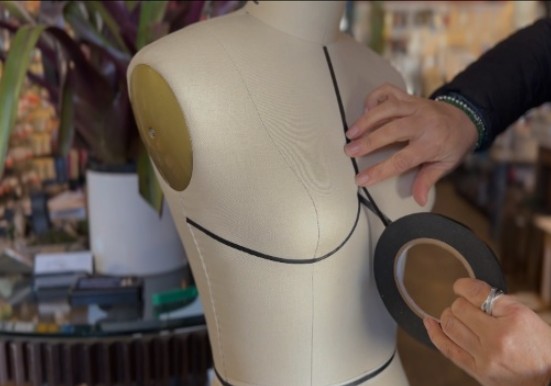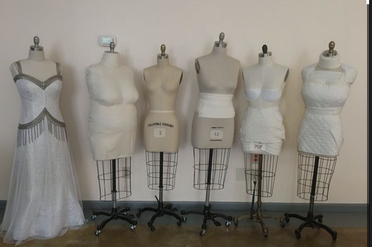 Description: Three-dimensional body replicas, usually made of padded fabric over a hard inner core, used as a base for draping fabric and constructing patterns. Draping mannequins represent standard or custom body measurements and allow designers to shape, pin, and mark fabric directly on the form. They are essential for visualizing and adjusting fit, silhouette, and style lines in costume creation. They come in standardized sizes and may or may not include arm attachments or legs. The draper will pad them out to more precisely match an actor’s measurements.