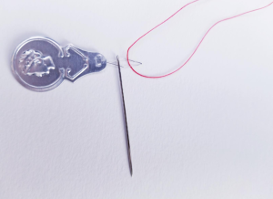 If you are struggling to thread, you may find a needle threader helpful. It uses a small wire loop that you insert through the needle eye, then use it to catch the thread and pull it through.