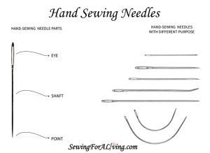 A hand sewing needle has three main parts: the eye, the shaft, and the point. The eye is the hole where the thread is inserted, the shaft is the body of the needle, and the point is the sharp end that pierces the fabric. They come in a variety of sizes, shapes, and point styles suitable for various fabric types.