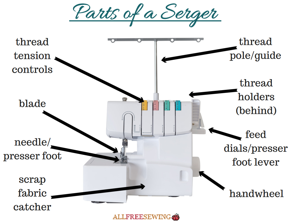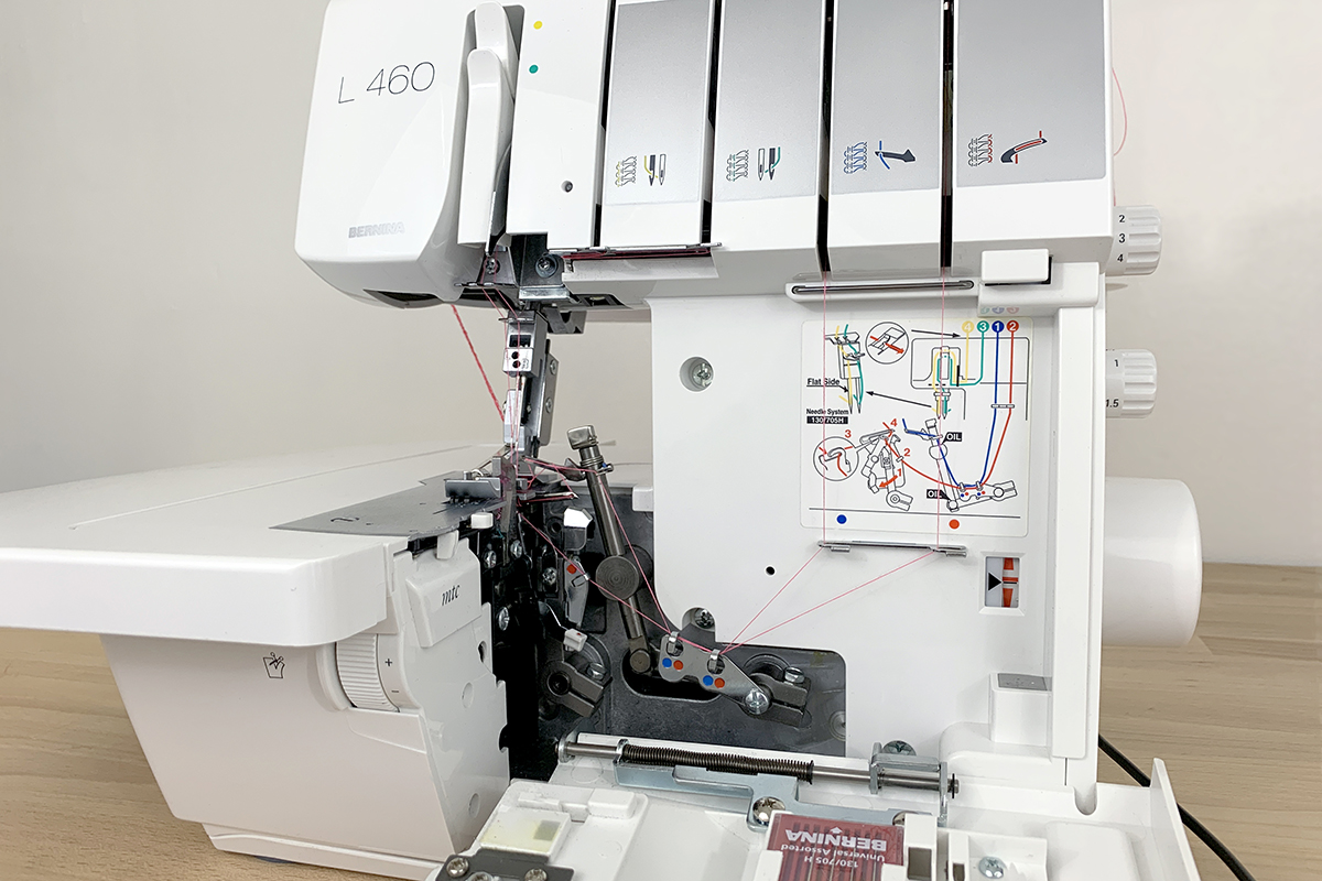 Threading the serger can seem overwhelming, as it involves navigating a series of tensioners to thread an upper and lower looper and 1-2 needles as well as choosing multiple appropriate settings for your desired stitch. However, with a pair of tweezers, patience, and practice anyone can successfully navigate the process. Most machines feature a color-coded step-by-step guide on the inside cover of the lower section and a guide to stitch settings.