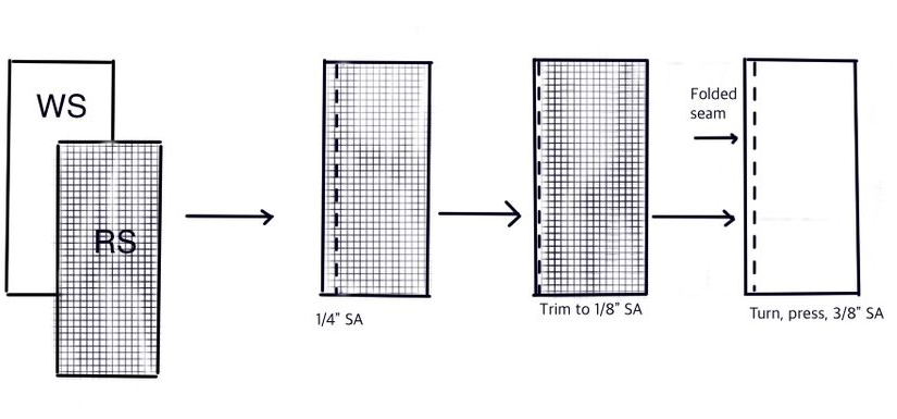 - Press the other seam allowance over the trimmed allowance, turning the outer edge under it (encasing it).
