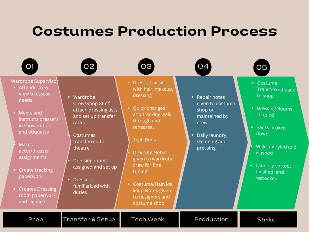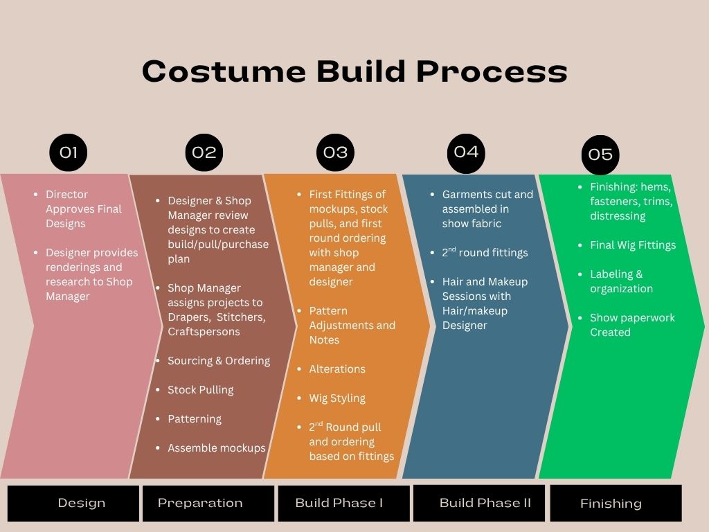 Once the costume design is finalized, costume technology work moves through two distinct phases: the build phase, which covers everything leading up to the show, and the production phase, which focuses on implementing and managing the costumes during the run.
