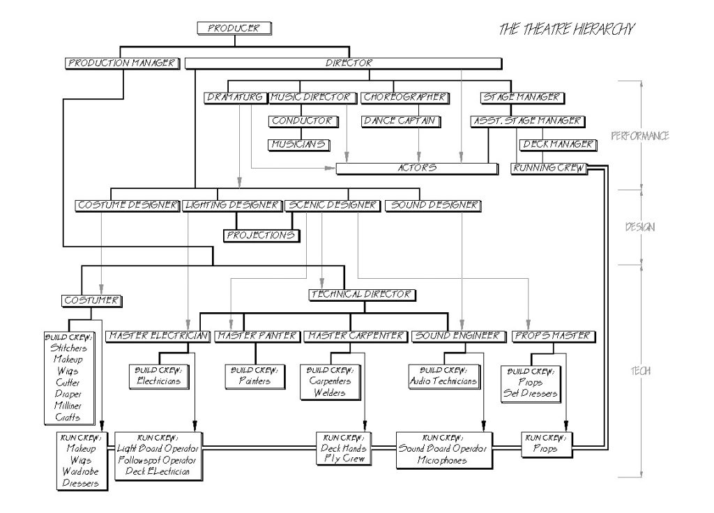The creation of a theatrical production is a collaborative effort involving a wide range of artistic, technical, and management professionals. The chart below outlines how these roles interconnect, from the producer and director who guide the overall vision, to designers, technicians, and performers who bring that vision to life. Each level of this structure plays a vital part in ensuring a successful production, with clear lines of communication and responsibility.