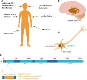 For example, Huntington’s Disease, a neurodegenerative disease with no cure resulting from a mutation in the HTT gene, has benefited greatly from animal model research. A mutant form of the HTT protein, mHTT, is produced when a mutation causing an inflation in the number of CAG repeats at the end of the gene sequence, and is cloven by enzymes into small, toxic fragments—an otherwise innocuous process in the normal HTT protein. These toxic fragments have the tendency to aggregate in neurons, leading to cell damage and cell death. Because it mostly affects neurons in the basal ganglia, the area of the brain responsible for controlling movement as well as aspects of mood, before later spreading to other parts of the brain, Huntington’s patients typically suffer hyperkinetic, jerky-like movement and psychiatric disturbances such as depression.