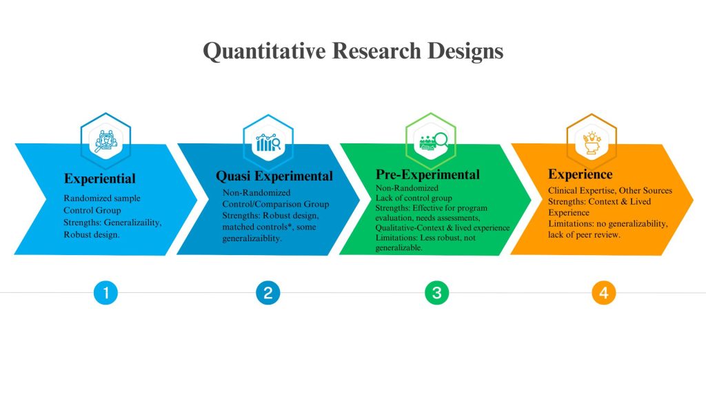 Experimental Designs share similarities with EBPs but may not be double-blind. In these studies, researchers know which participants are receiving the intervention and which are not (placebo). The primary goal is to determine whether a causal relationship exists between variables. Key elements include: