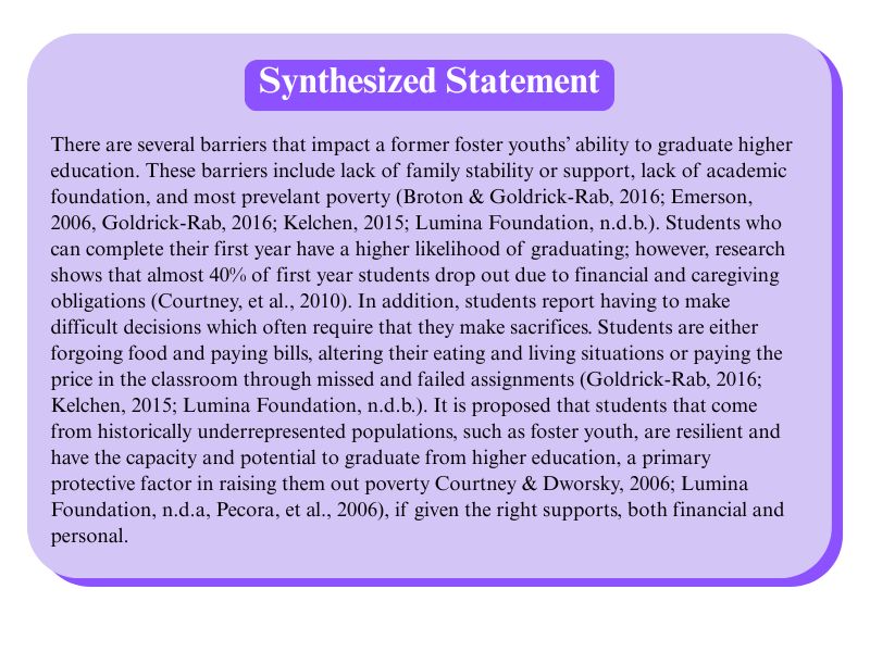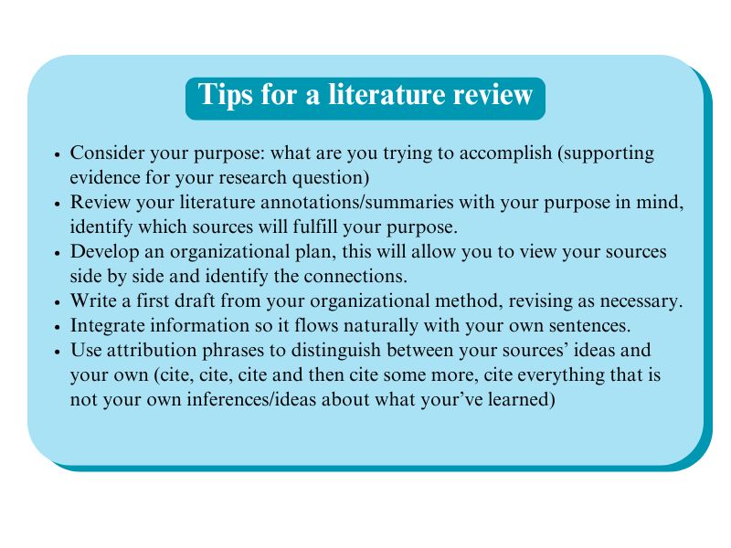 One of the primary goals of the literature review is to give your reader a well-rounded, evidence-based understanding of the social issue, drawn from multiple sources, through synthesized writing. Synthesis means combining two or more sources to build a clearer, more complete picture.