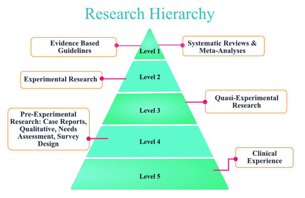 At the lowest level of the hierarchy, Level 5 includes theoretical articles, anecdotal evidence, and other sources that offer valuable insights but lack empirical testing