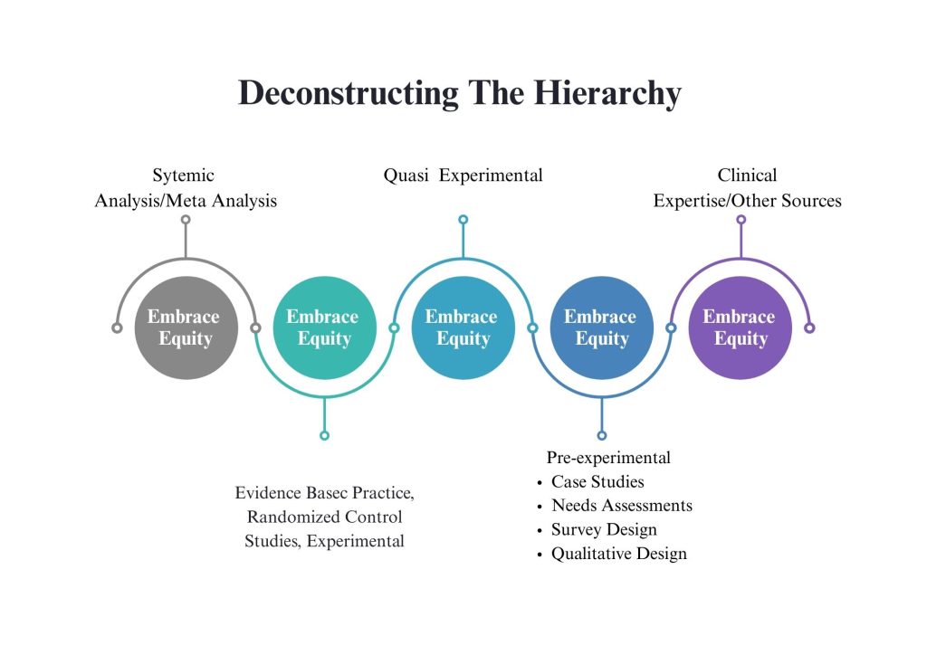 A Note of Caution: While the research hierarchy can be useful as a heuristic device, it is also problematic in how it values one form of knowledge over others. That is, such hierarchies fail to adequately attend to equity, intersectional identity, and the benefits of a postmodern perspective which values lived experience. We maintain that while all knowledge is not equal, all knowledge can be considered equally within the context of the strengths and limitations of the design. We invite you to think about the hierarchy of evidence, not as a privileged framework, but as a function of the design elements that provide more structure around research methodology, interpretation, and generalizability. The graphic below offers an alternative visualization, and later in this chapter we’ll reference the Multicultural Validity approach to contemporary analysis.