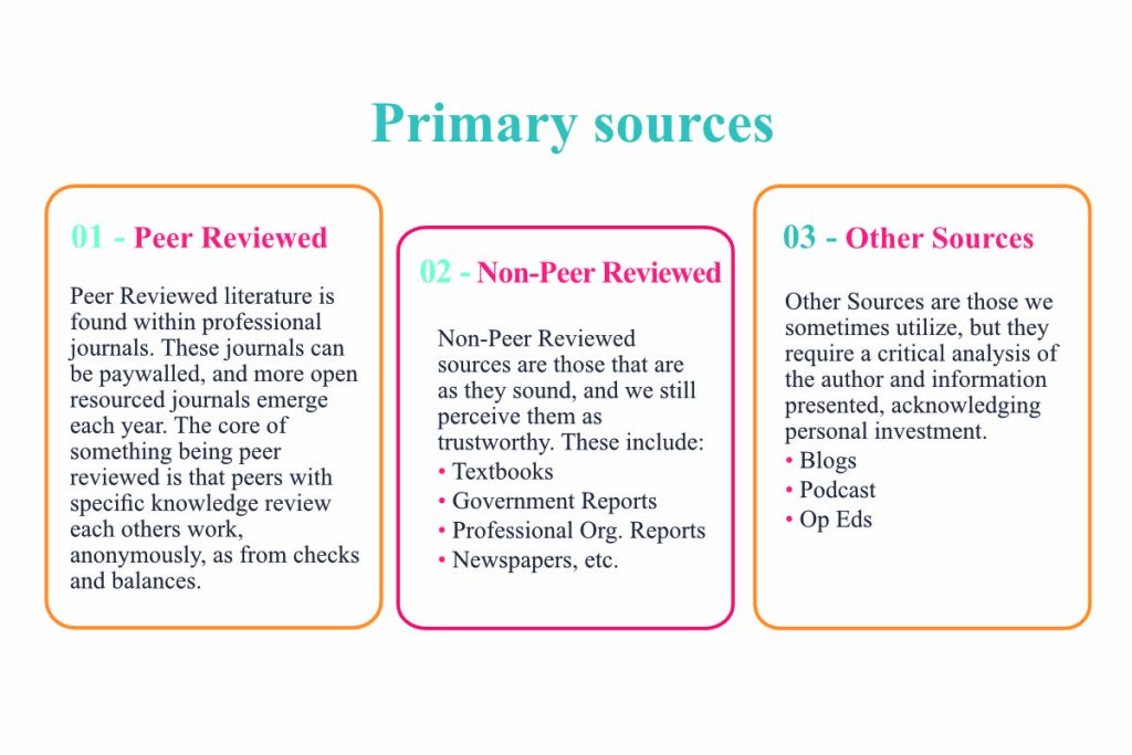 This section will describe the different ways in which data and knowledge is provided to us. We can engage knowledge and expand our understanding through three primary means: (1) peer reviewed journals, (2) non-peer reviewed sources, and (3) other information. Within each of these different categories are multiple venues for knowledge sharing. As you’re reviewing these primary sources of information always be sure to critically consider who is writing it, saying it, offering it, and what trust do we have in their story, their evidence. What is their positionality, who are they in the world, and how does that inform our comfort with the information they have shared?
